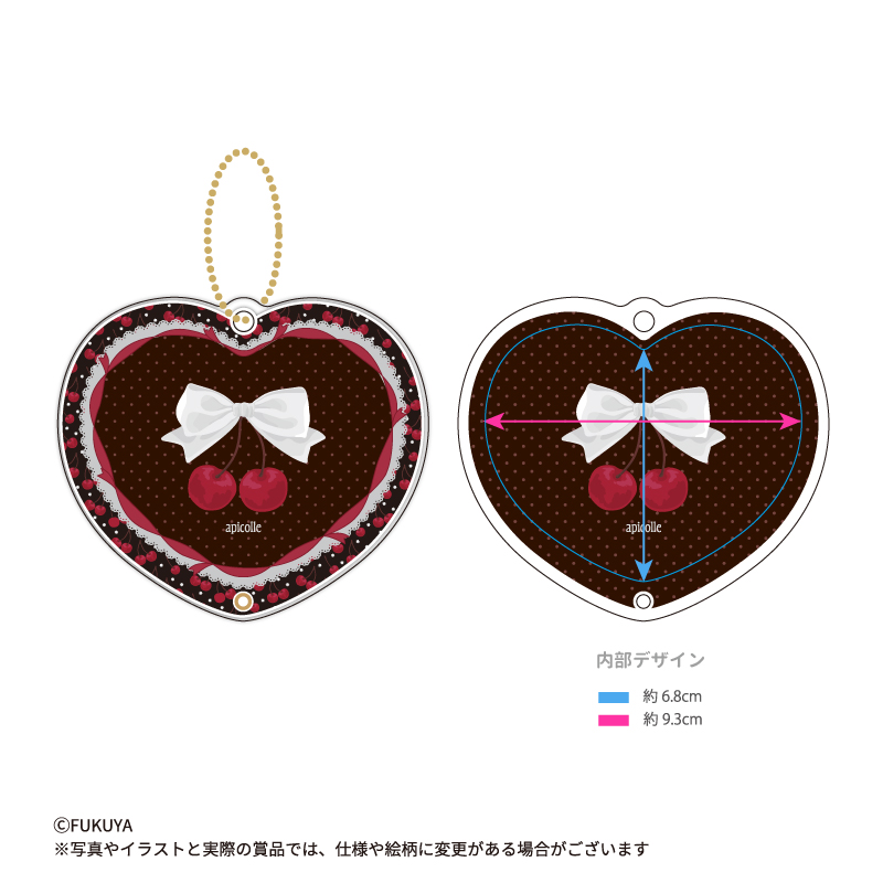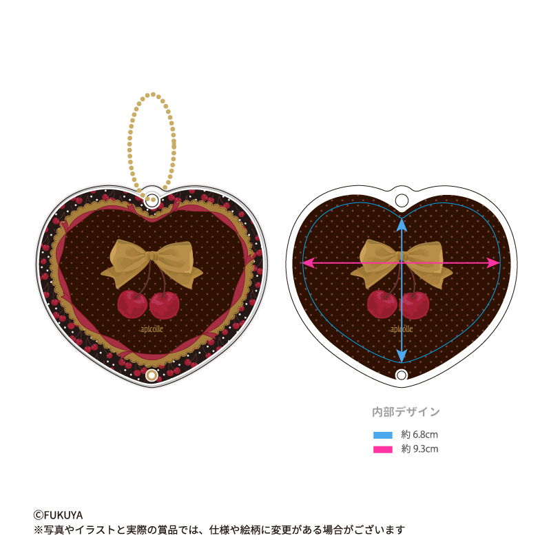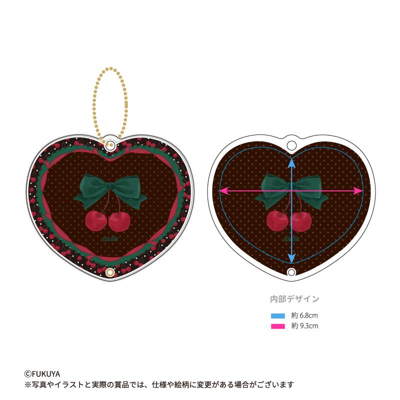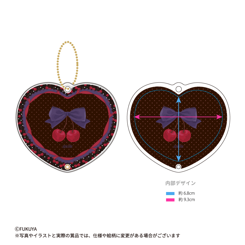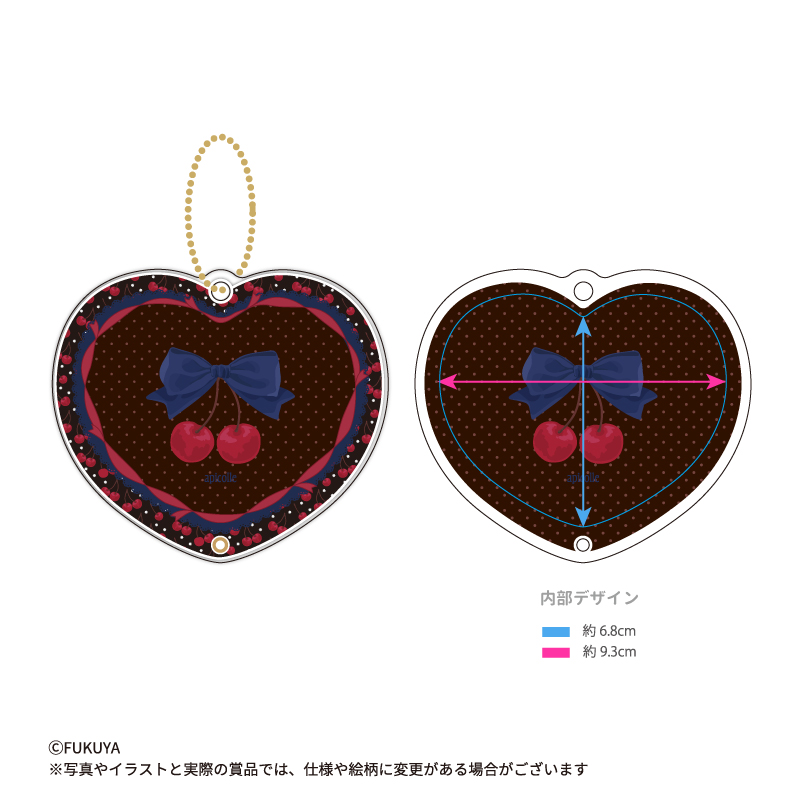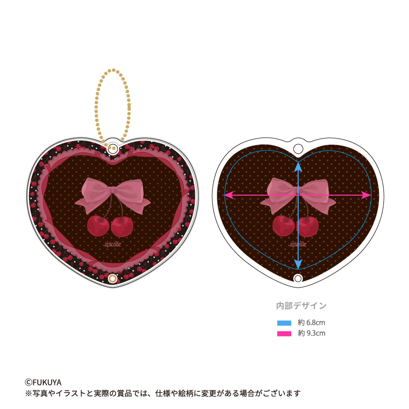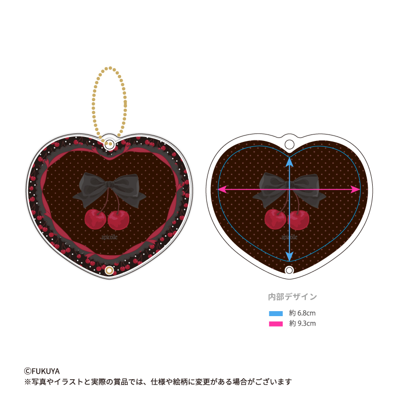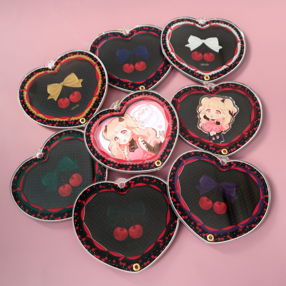 暗めのチェリーと大きなリボンがかわいいデザインのハート型アクリルフレームです。小さいグッズの収納がおすすめ!