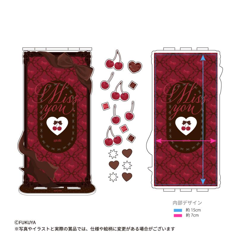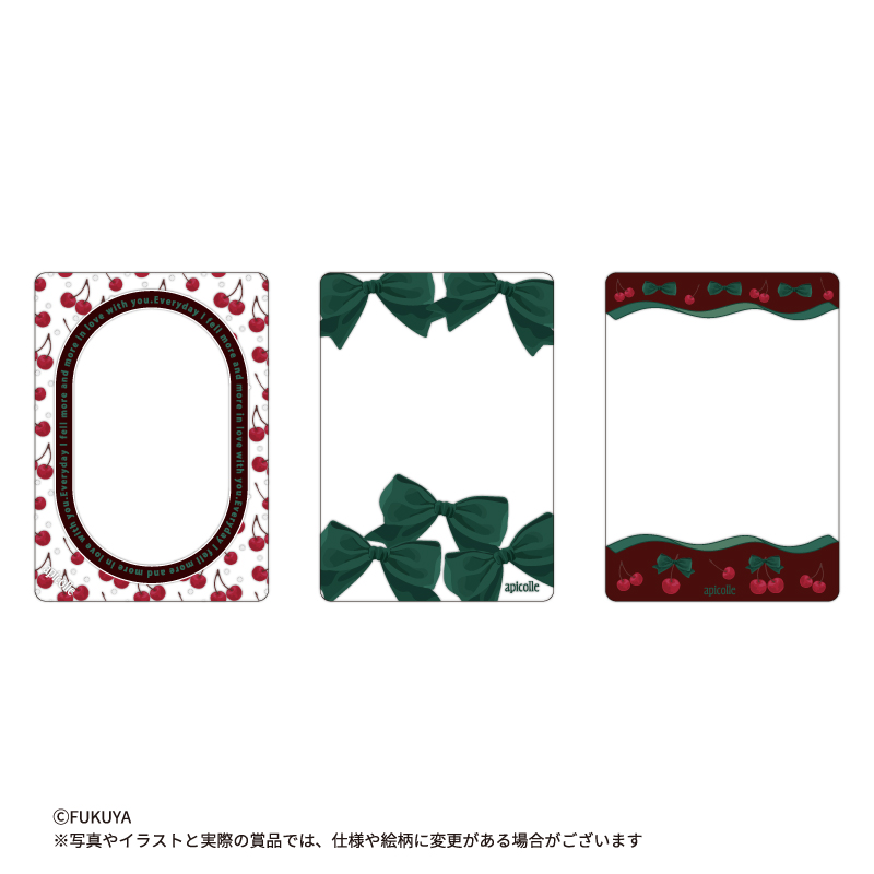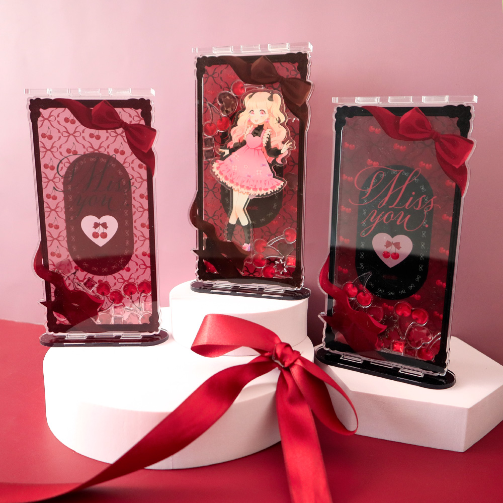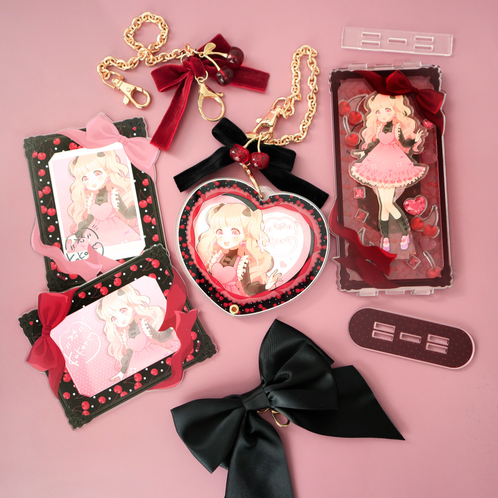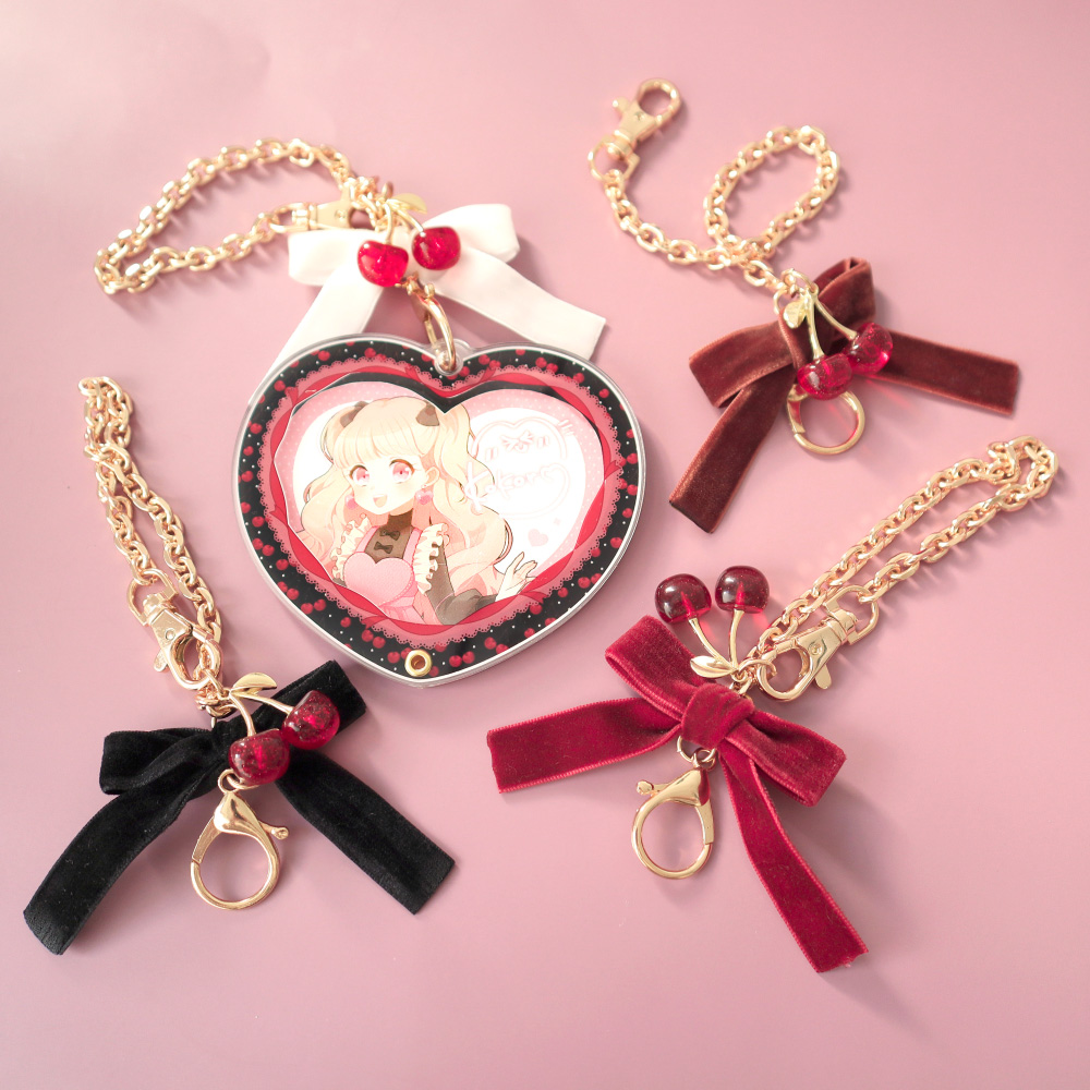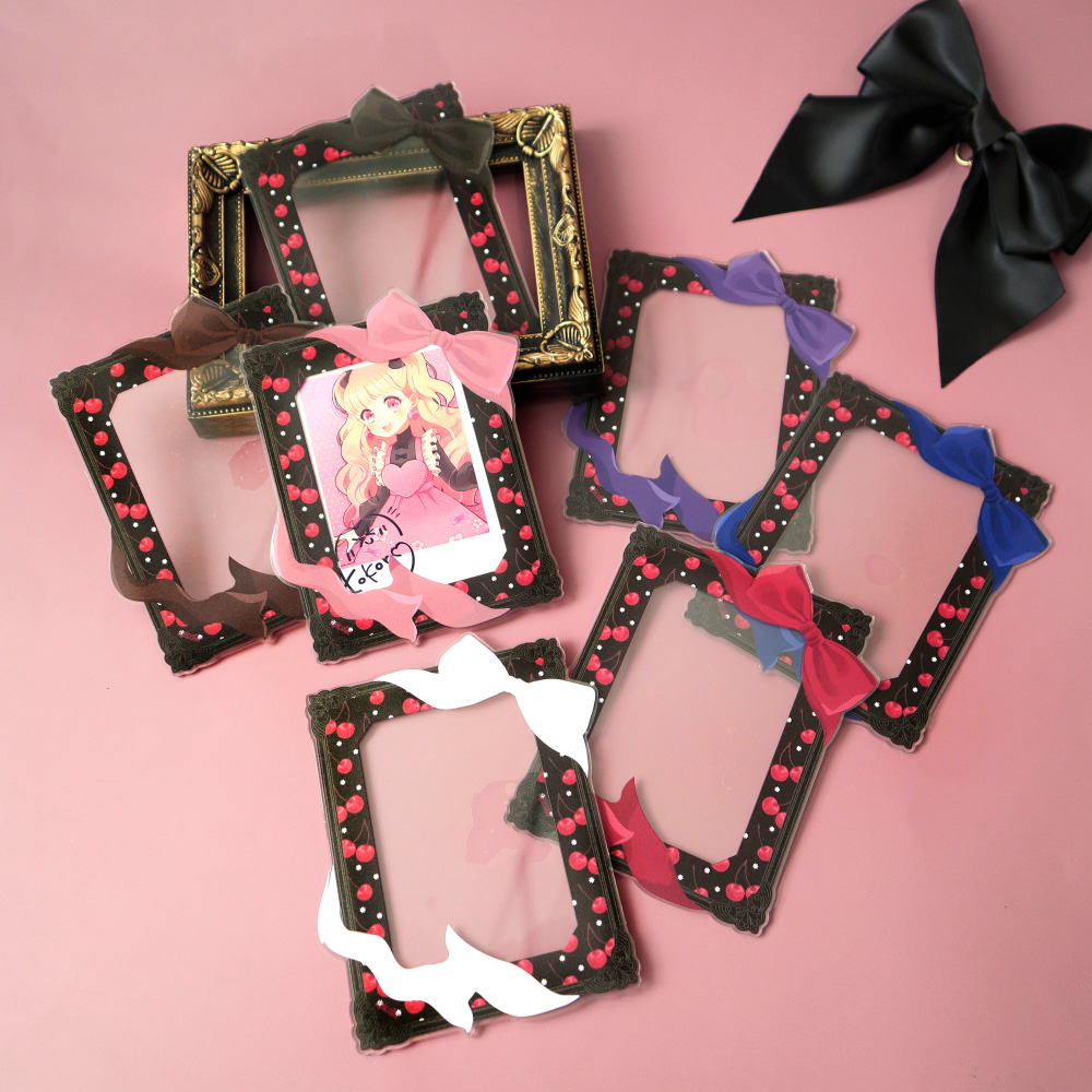 暗めのチェリーと大きなリボンがかわいいデザインのハート型アクリルフレームです。小さいグッズの収納がおすすめ!