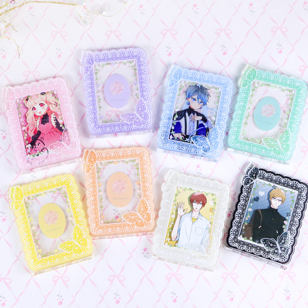 パピヨンのレースに囲まれたアクリルカードスタンド。トレカやインスタントフォト等、1mm厚までのカードを挟んで飾れます。