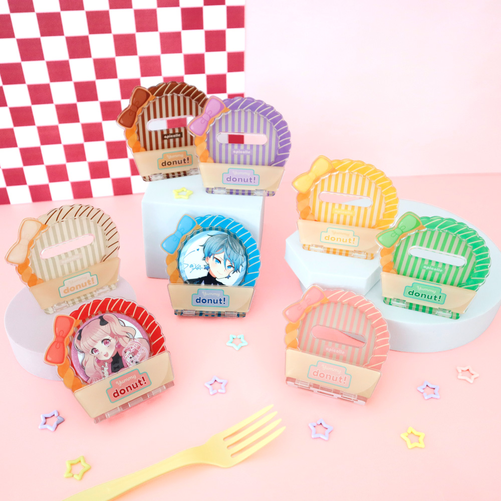 φ57mm缶バッジが飾れる、アイシングクッキー付きのツイストドーナツで囲われた缶バッジスタンド。