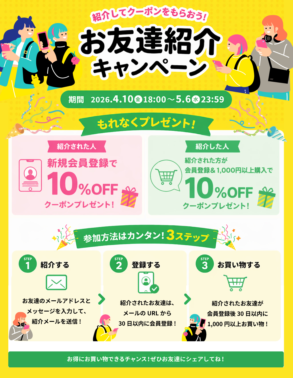 ・紹介した方は、紹介された方が会員登録後30日以内に1,000円以上ご注文・お支払いいただくと特典対象となります。
