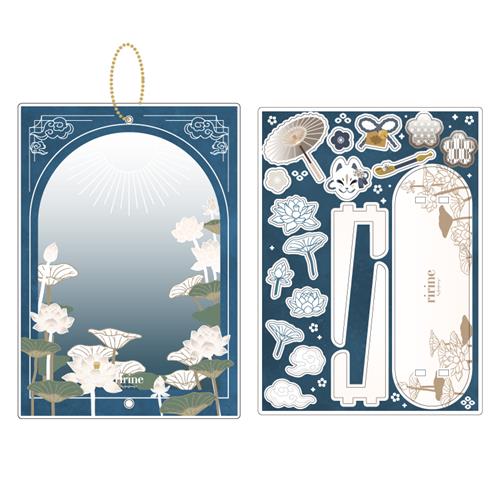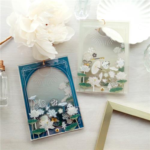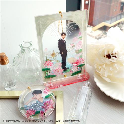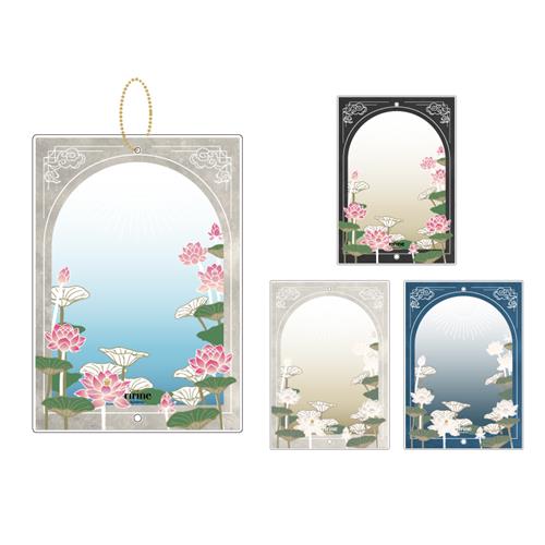 白い繊細なラインアートで描かれた蓮を、蓮が映える配色と共にデザイン。