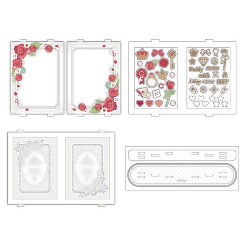 白いクラシカルな額縁に、華やかな薔薇や花々があしらわれたエレガントなデザイン。