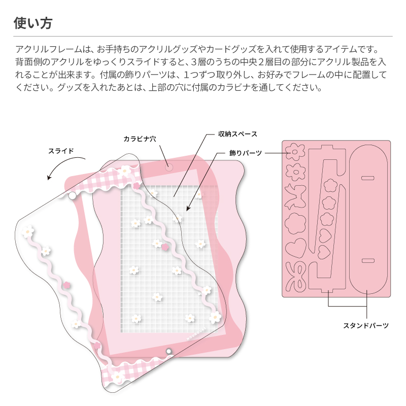 • 中に入れたお手持ちのアクリルグッズは、アクリルフレーム内で固定はされません。