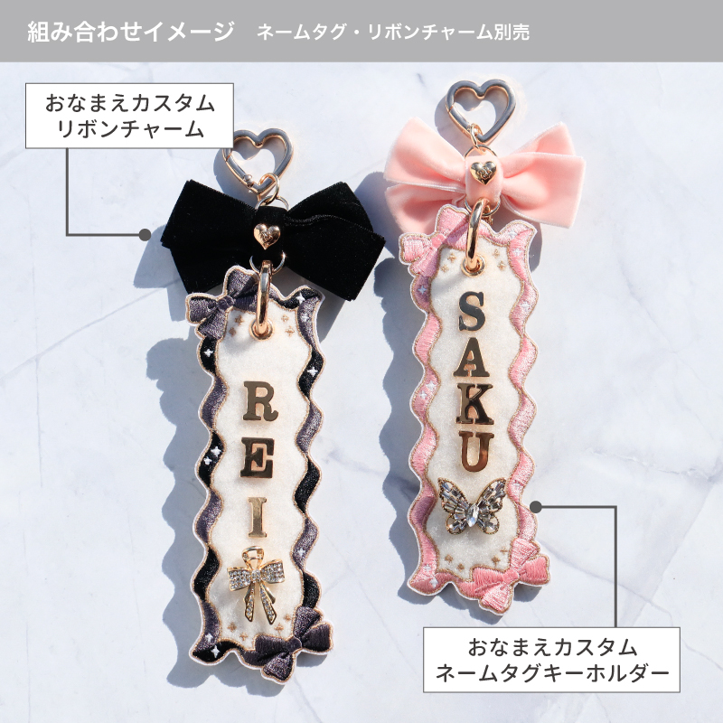 同時発売のネームタグ本体とリボンチャームを組み合わせて、自分だけのキーホルダーを作ることが出来ます。