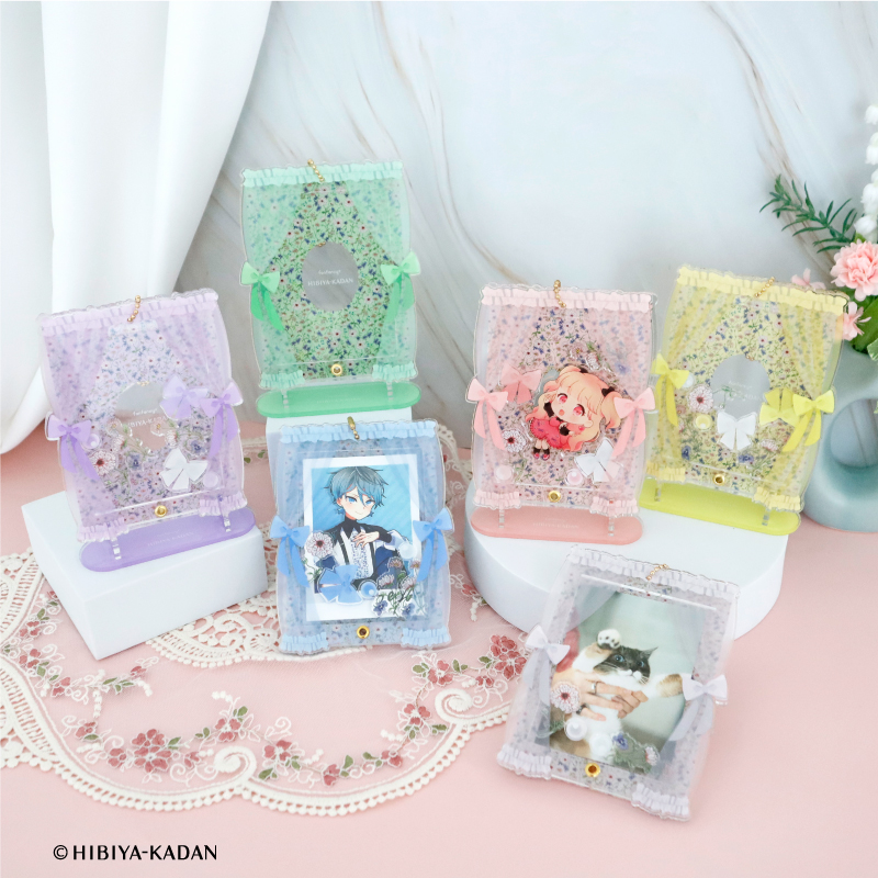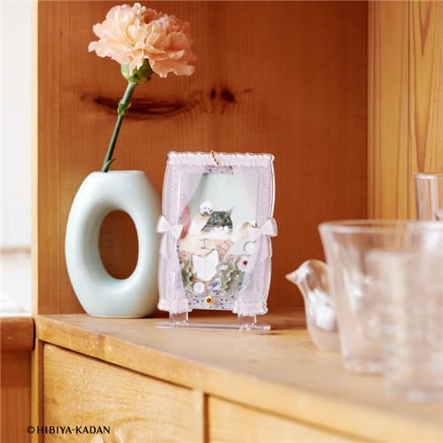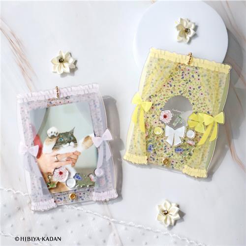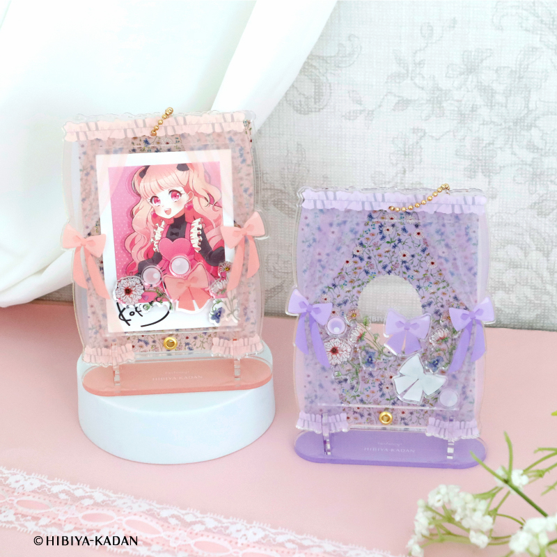 「fanfancy+×日比谷花壇 フローラウィンドウアクリルフレーム カードサイズ」は咲き誇るお花にカーテンのモチーフをあしらった、春らしい透け感のあるアクリルフレームです♪