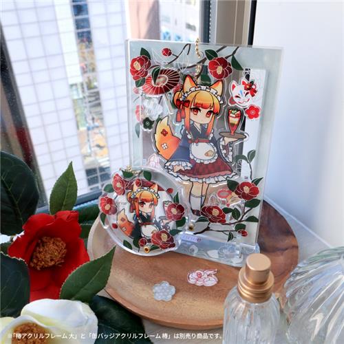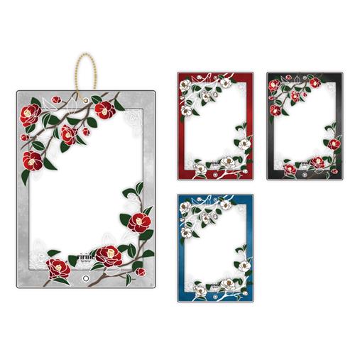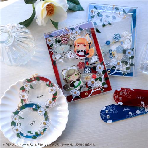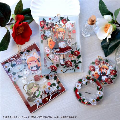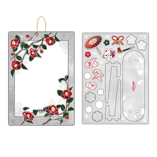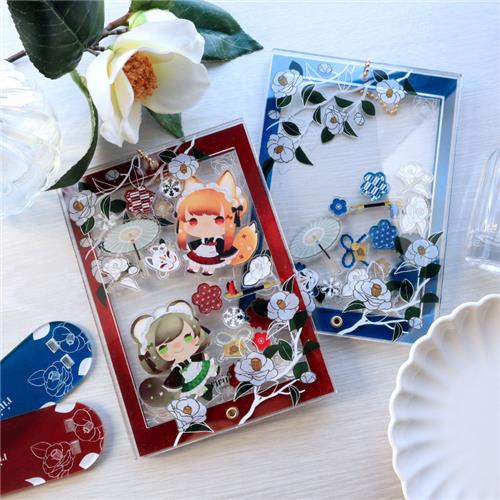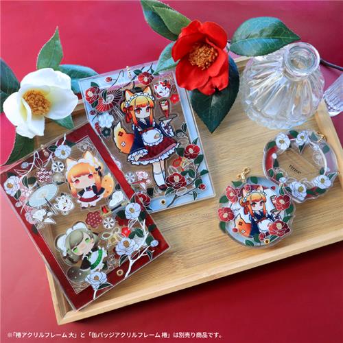 白い繊細なラインアートで描かれた椿を、椿が映える配色と共にデザイン。