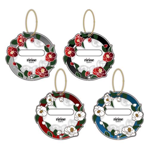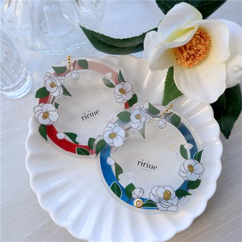 白い繊細なラインアートで描かれた椿を、椿が映える配色と共にデザイン。