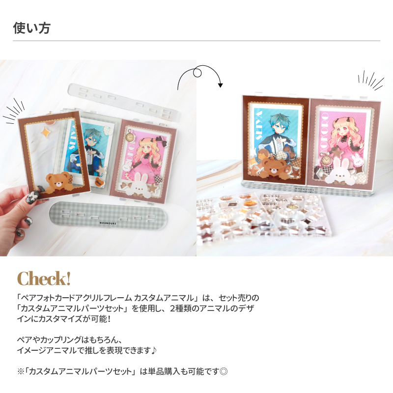 ペアフォトカードアクリルフレーム カスタムアニマル ペアフォトカードアクリルフレーム カスタムアニマル NOUNOURS by fanfancy+から、2つの枠を自由にカスタマイズして、ペアでグッズが飾れる「ペアフォトカードアクリルフレーム カスタム」シリーズに、アニマルが新登場! POINT1 既存のアニマルに新たにカラスが加わり12種類に♪全78通りの組み合わせをお楽しみいただけます! POINT2 「ペアフォトカードアクリルフレーム」は1層目が2枚に分かれている特殊構造のアクリルフレームなので、左右も自由にカスタムできます! POINT3 ペアやカップリングはもちろん、イメージアニマルで推しを表現するのも◎豊富なバリエーションから、推しにピッタリのアニマルを見つけてください! 対象商品はこちら 受注生産商品 2026年2月上旬~中旬お届け NOUNOURS by fanfancy+ 【セット商品】ペアフォトカードアクリルフレーム カスタムアニマル 販売価格¥3,080 カートへ追加 受注生産商品 2026年2月上旬~中旬お届け NOUNOURS by fanfancy+ カスタムアニマルパーツセット カラス 販売価格¥770 カートへ追加 受注生産商品 2026年2月上旬~中旬お届け NOUNOURS by fanfancy+ カスタムアニマルパーツセット シャチ 販売価格¥770 カートへ追加 受注生産商品 2026年2月上旬~中旬お届け NOUNOURS by fanfancy+ カスタムアニマルパーツセット サメ 販売価格¥770 カートへ追加 受注生産商品 2026年2月上旬~中旬お届け NOUNOURS by fanfancy+ カスタムアニマルパーツセット きつね 販売価格¥770 カートへ追加 受注生産商品 2026年2月上旬~中旬お届け NOUNOURS by fanfancy+ カスタムアニマルパーツセット おおかみ 販売価格¥770 カートへ追加 受注生産商品 2026年2月上旬~中旬お届け NOUNOURS by fanfancy+ カスタムアニマルパーツセット とら 販売価格¥770 カートへ追加 受注生産商品 2026年2月上旬~中旬お届け NOUNOURS by fanfancy+ カスタムアニマルパーツセット パンダ 販売価格¥770 カートへ追加 受注生産商品 2026年2月上旬~中旬お届け NOUNOURS by fanfancy+ カスタムアニマルパーツセット ひつじ 販売価格¥770 カートへ追加 受注生産商品 2026年2月上旬~中旬お届け NOUNOURS by fanfancy+ カスタムアニマルパーツセット いぬ 販売価格¥770 カートへ追加 受注生産商品 2026年2月上旬~中旬お届け NOUNOURS by fanfancy+ カスタムアニマルパーツセット ねこ 販売価格¥770 カートへ追加 受注生産商品 2026年2月上旬~中旬お届け NOUNOURS by fanfancy+ カスタムアニマルパーツセット うさぎ 販売価格¥770 カートへ追加 受注生産商品 2026年2月上旬~中旬お届け NOUNOURS by fanfancy+ カスタムアニマルパーツセット くま 販売価格¥770 カートへ追加 ブックマークに追加 フォルダ名 に 追加 キャンセル ブックマークに追加しました ブックマーク一覧に移動 閉じる カートに入れました カートを見る 閉じる VIEW ALL VIEW ALL